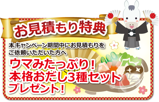 本キャンペーン期間中にお見積もりいただいたお客様には、「ウマみたっぷり!本格おだし3種セット」をプレゼント!