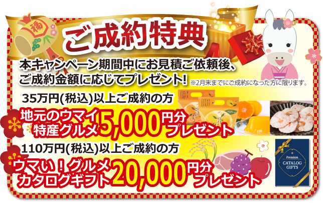 1月6日~1月31日の期間中にお見積もり後、2月末までにご成約いただいたお客様には、ご成約金額に応じて豪華なプレゼントをご用意しています!