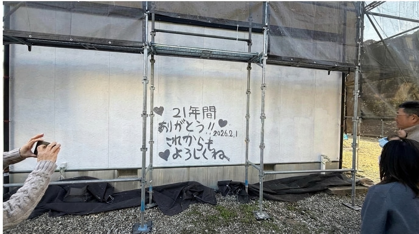 また、「感謝のかべ」を実施、ご家族皆様に集まっていただきお家や家族への感謝を外壁に書いていただきました。